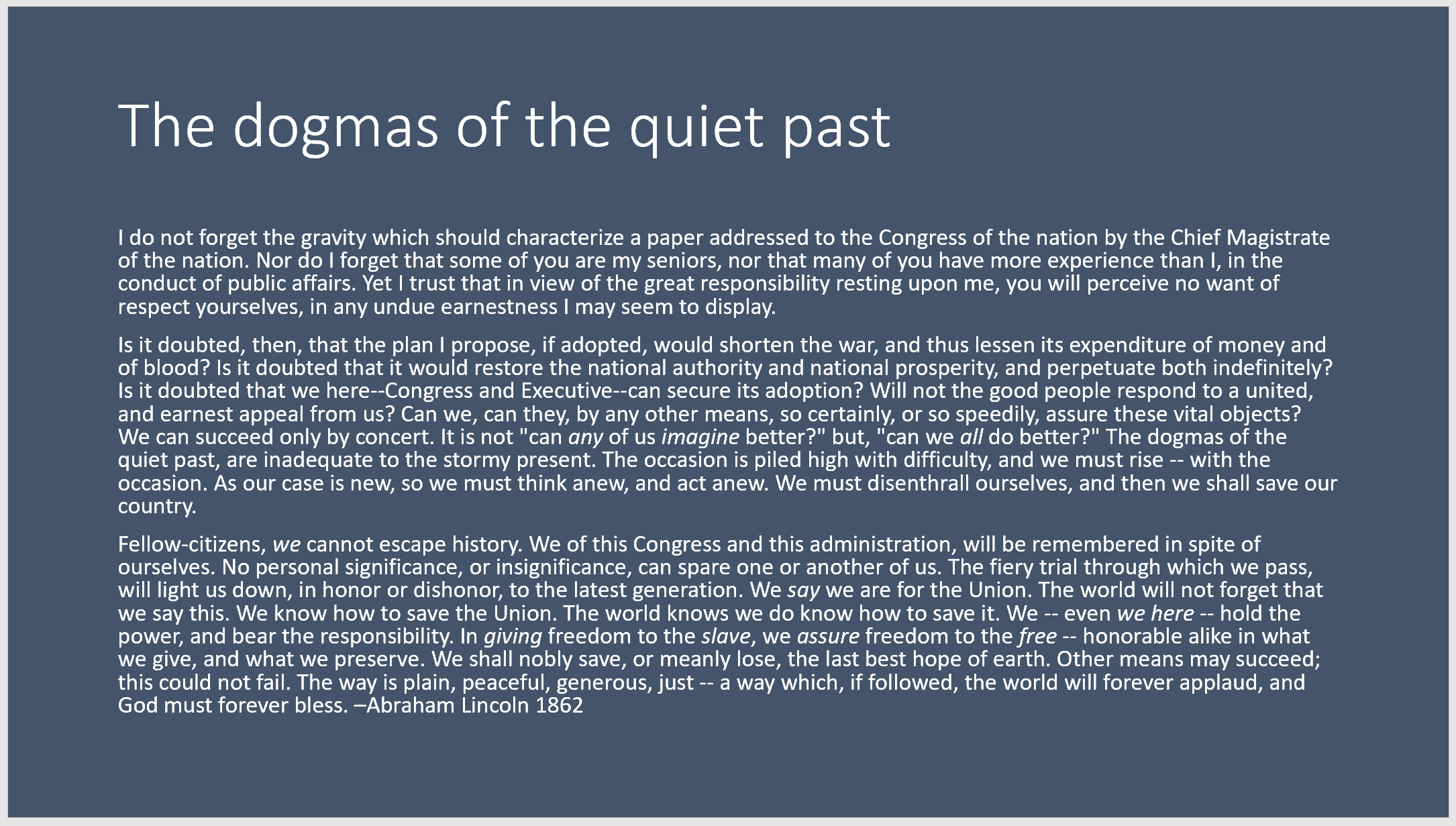 It can be difficult to let go of a favorite quote or passage, but as Slide C shows, too much material will overload your slide and your audience. Slide D, on the other hand, highlights the most significant aspect of the phrase and includes an image to help the audience connect with it. If you’re concerned that your slides will be too brief, remember that you may still include the entire statement in your presenter notes and read it while presenting your visual aid.