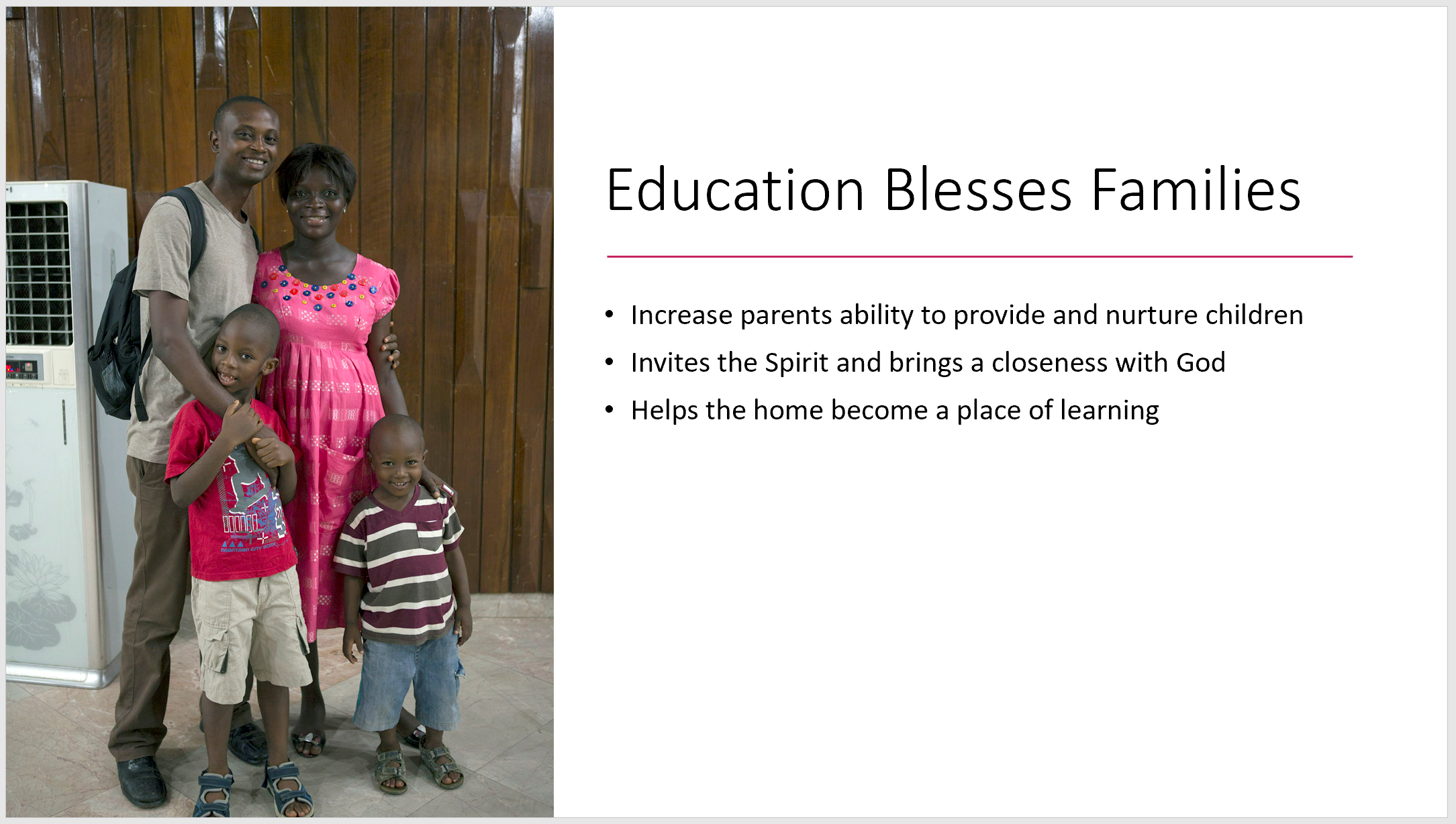 Slide F’s graphic complements the slide’s concept of education benefiting families. It’s more genuine, and your audience is more inclined to connect with it. It also demonstrates that you put forth a little more effort to pick the correct image rather than grabbing a random clip art image off the internet.
